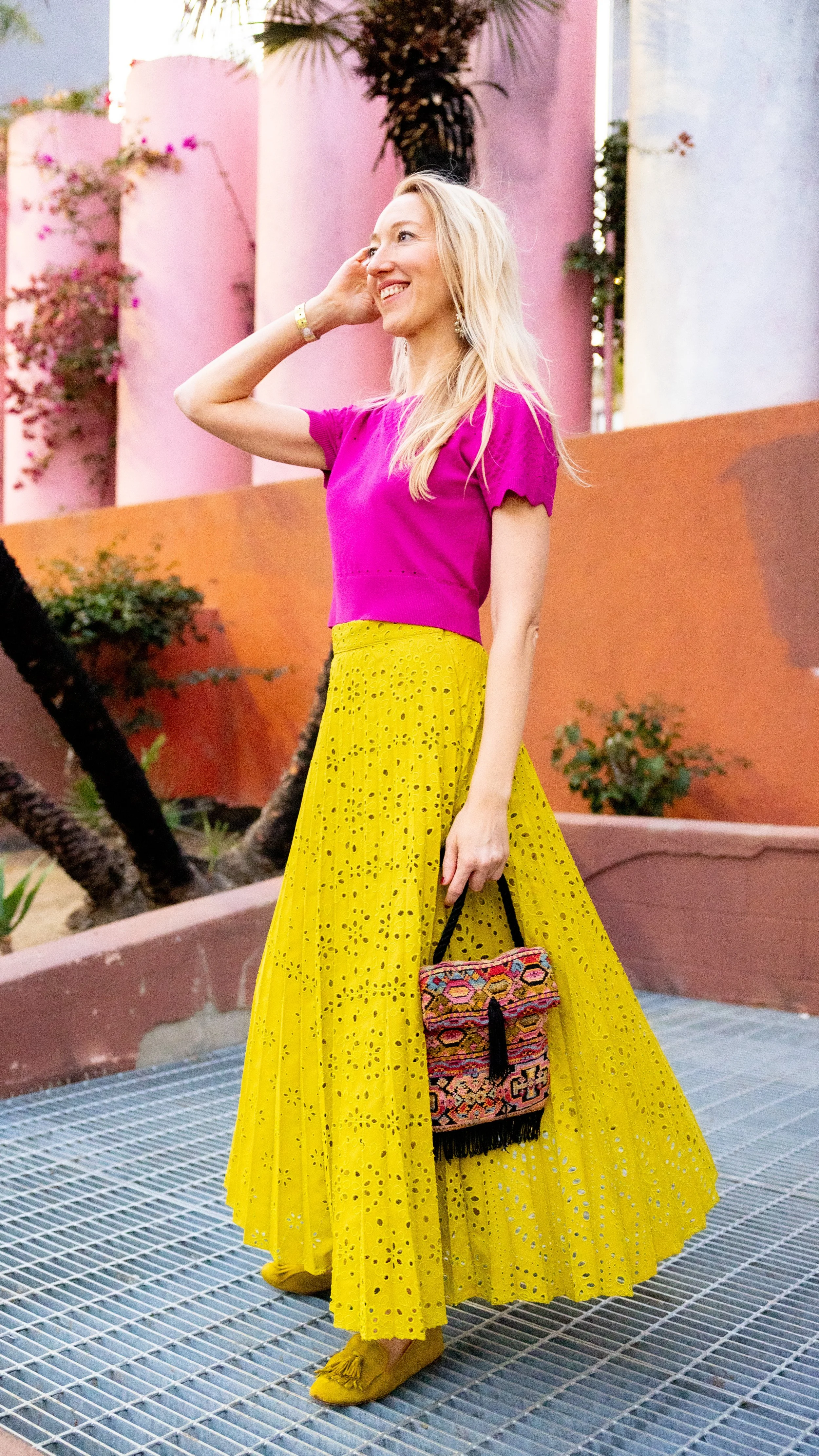 My vintage friend Jillian @jillsvintagevault likes to say that chartreuse goes with everything. Despite the fact that it is one of the rainbow’s most mercurial, strange, demanding, unusual, and shape-shifting colors, chartreuse does, in fact, play shockingly well with other tones. With an ounce of bravery, you can pair chartreuse with brights or neutrals and find combinations that sing even more beautifully than the color on its own. Some of my favorites include magenta or fuchsia, plum, emerald green, and a deep blue-purple I like to call Lanvin blue (after Jeanne Lanvin’s favorite shade). But if you want to ground chartreuse in more subdued territory, pair it with black or brown.