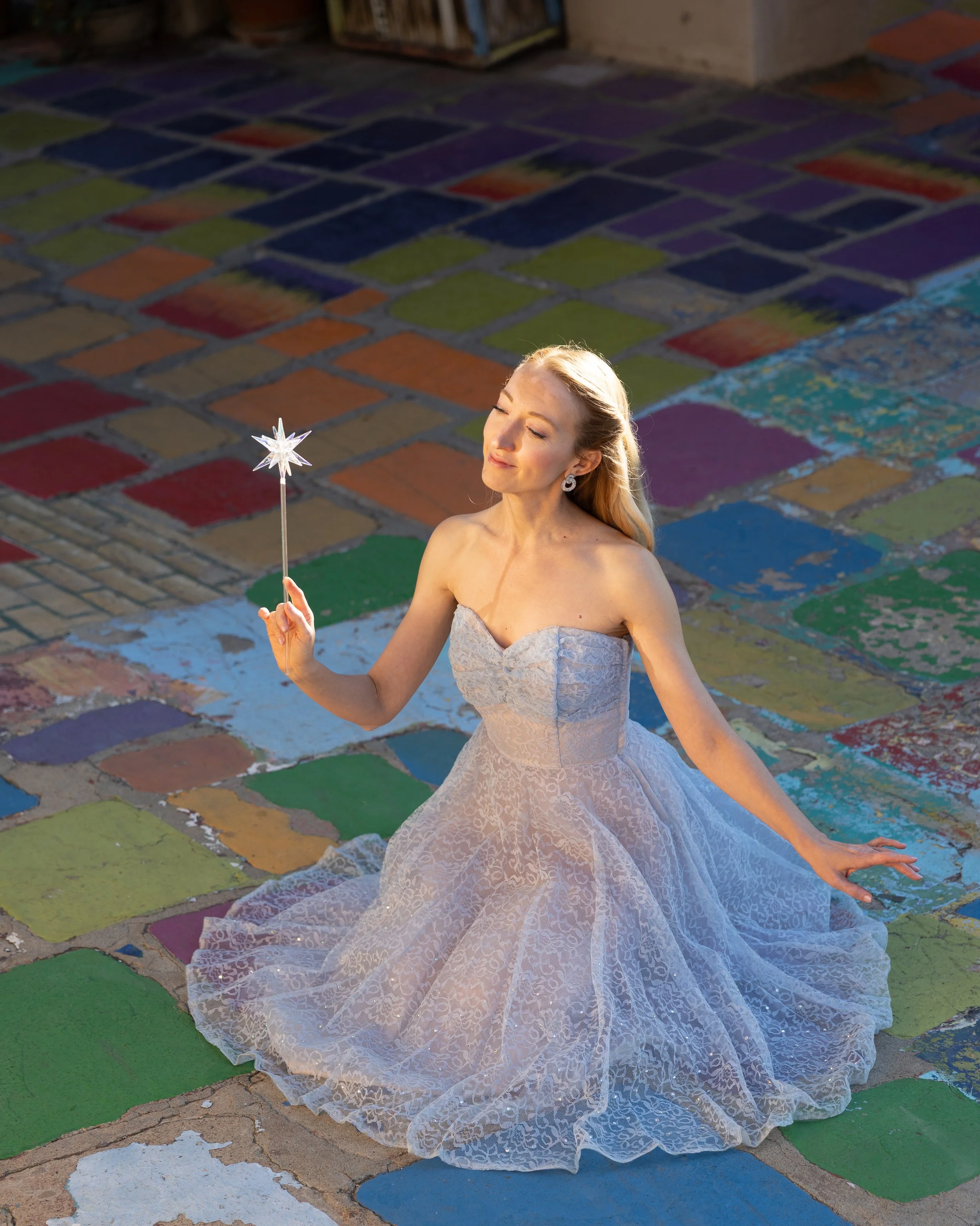 I found this blue one with a kind of blush layer underneath the light blue lace, and I added a layer of lavender tulle under there as well. More photos and dress details on the two Glindas (and that wand!) on Frim Fram Frocks’ Substack.